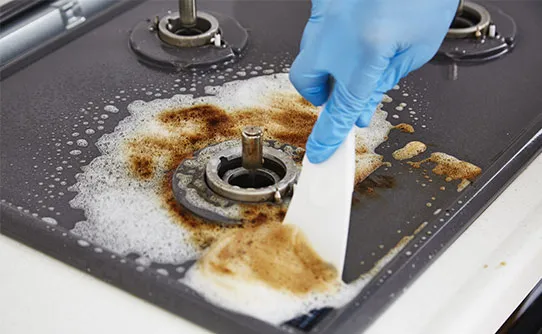 ガスコンロまたはIH、五徳の浸け置き、調理台、シンク、排水口、壁、床、棚(表面)。魚焼きグリルは対象外。