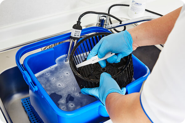 分解したパーツを60度のお湯と特殊な専用洗剤にじっくりつけ置きします。汚れの落ち具合を見極めながら、隙間の隅々まで丁寧に汚れを取り除きます。