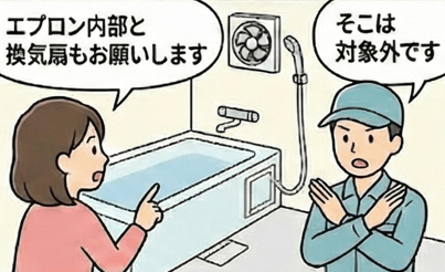 浴室クリーニングは業者ごとに作業範囲が大きく違い、エプロン内部・換気扇・鏡のウロコ取りなどは対象外になることが多い部分です。