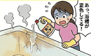 | 掃除の流れ | Aさんは浴槽の黄ばみを落とそうと、業務用の強力洗剤をそのまま原液で使用しました。 |