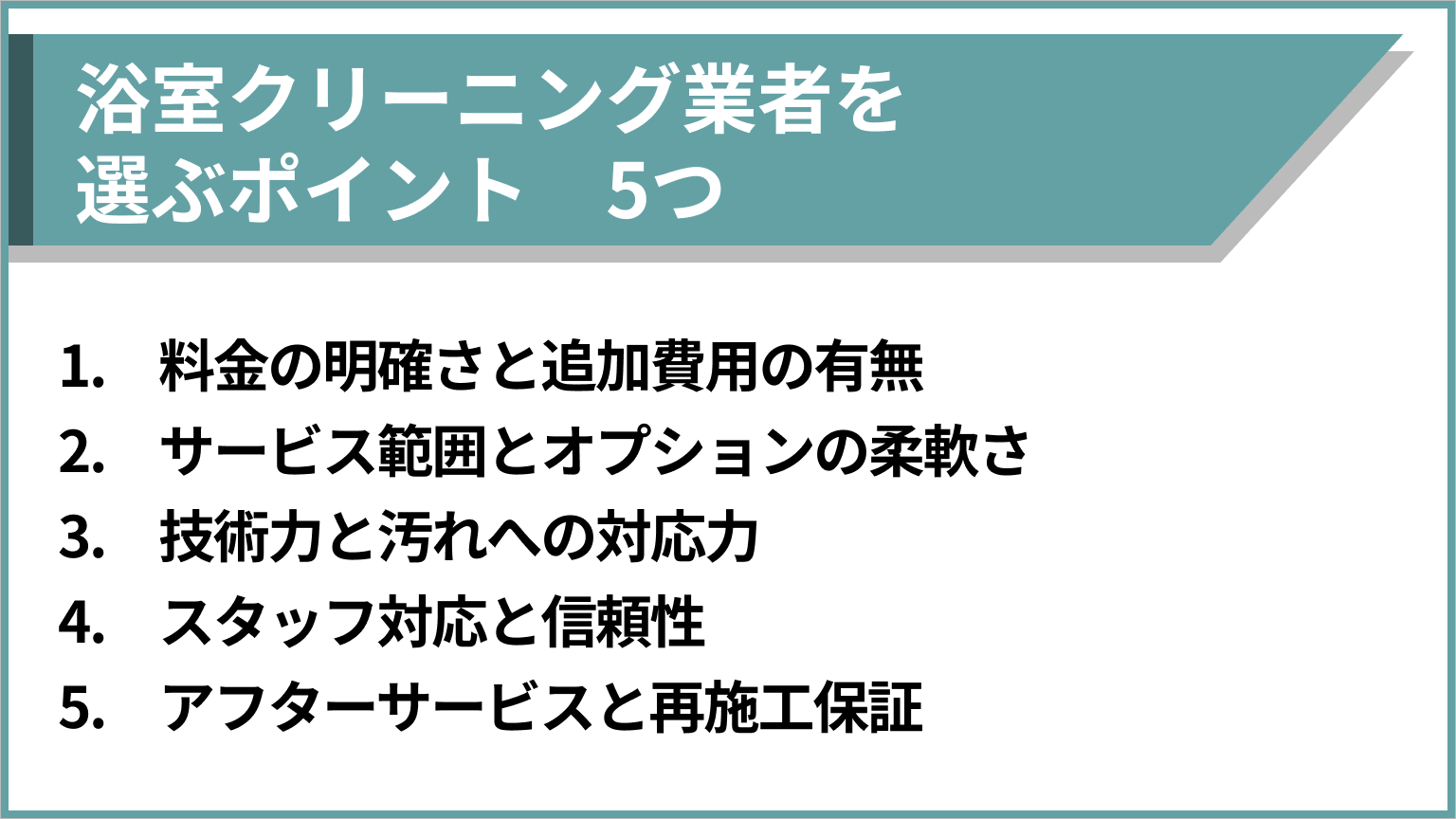 このような失敗を紐解いて導き出した「浴室クリーニング業者を選ぶポイント」が、以下の5つです。