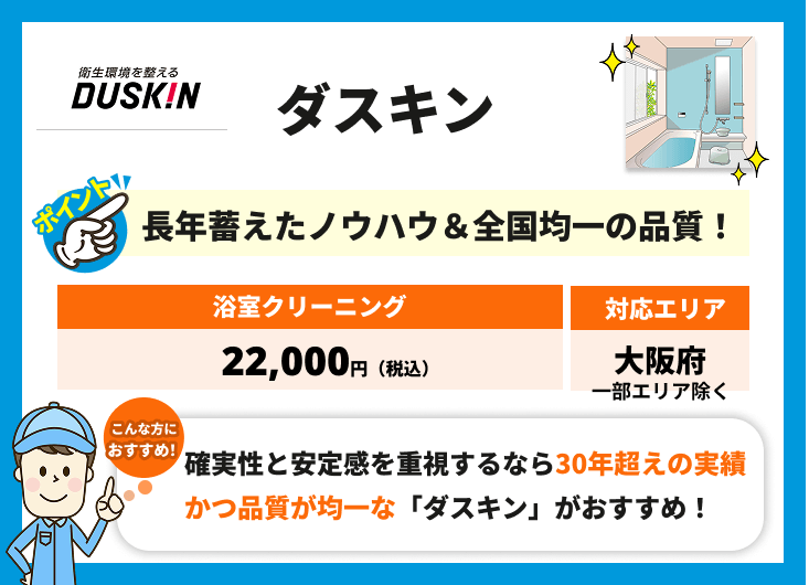 大阪は、築古〜最新設備まで「浴室スペックの幅」が広い地域です。そうした環境で必要なのは、設備トラブルを起こさない安全性・部品構造を理解した正確な作業であり、ダスキンはまさに「安心の専門家」といえます。