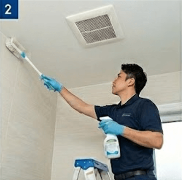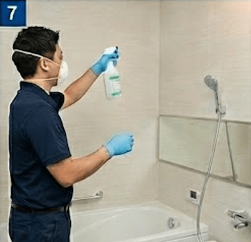 浴室全体に専用の防カビ剤・抗菌剤を噴霧し、表面にコーティングを形成。天井・壁・床・換気扇など湿気が溜まりやすい部分を重点的に処理します。