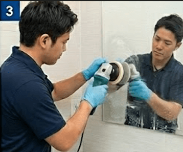 酸性洗剤で水垢を軟化させ、専用の研磨パッドやダイヤモンドパッドで頑固なウロコを削り落とします。