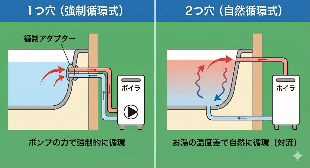 追い焚き配管には、「強制循環式」と「自然循環式」の2タイプがあります。