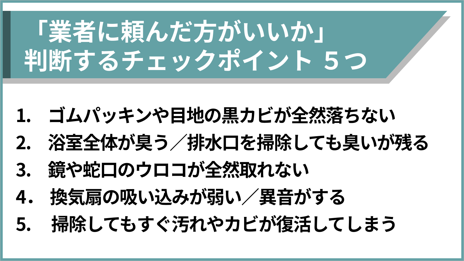 お風呂の掃除を「自分でやるか業者に頼むか迷う」方に向けて、判断できる具体的なチェックポイントを5つにまとめました。