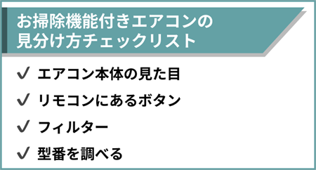 「お掃除機能付き」エアコンかどうか見分けるには、下記の項目をチェックします。