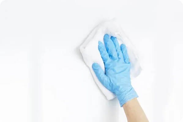 浴室全体のカビが生えている箇所(タイル目地、パッキン、コーキング部分など)を中心に、カビ取り剤を塗布し放置後、ブラシ等で除去。浴室全体のカビ汚れを除去したら、浴室全体を流水で洗浄成分をよく洗い流します。