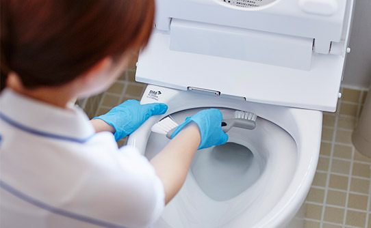 洗剤を全体に塗布し10〜20分放置し、次に尿石や水垢を除去します。便座が外せる場合は便器から取り外し、便器内部はブラシを使用し洗浄します。便座とフタ、便器の外側などそれぞれ丁寧に拭き上げを行います。