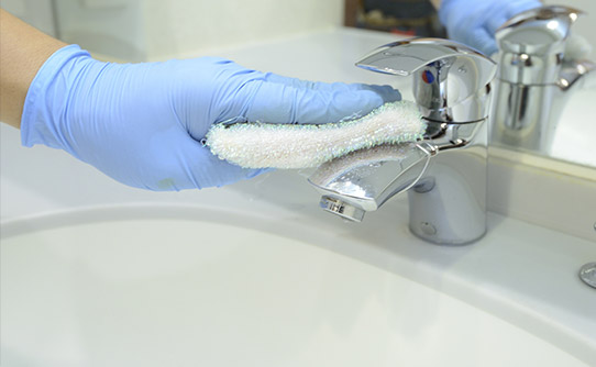 洗剤を全体に塗布し擦り洗いを行い、水垢はブラシ等で除去します。次に排水口に洗剤を塗布します。最後にクロスで蛇口を磨き上げます。