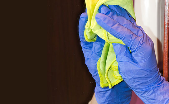 天井と壁面はホコリを落とした後、タオルで拭き上げます。戸棚は洗剤を塗布した布で拭き上げ、洗剤が残らないように水拭きします。床全体は水拭きを行いますが、汚れがひどい場合、戸棚同様洗剤を使用し拭き上げます。