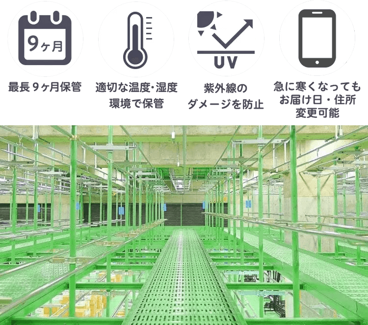 +4,400円/1パックで9ヶ月保管可能。温度・湿度管理された専門保管庫で大切に保管しカビやダニを防ぎます。