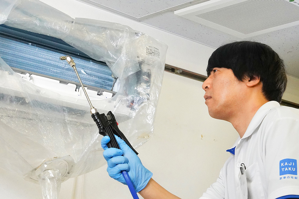 予約日時にハウスクリーニングのプロがサービス実施。サービス前後に、お客さまと一緒に内容、範囲、正常動作等の確認を行います。