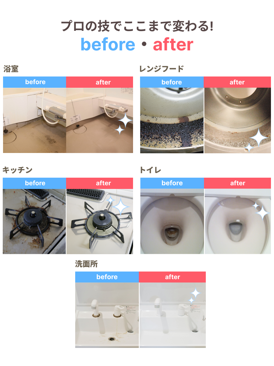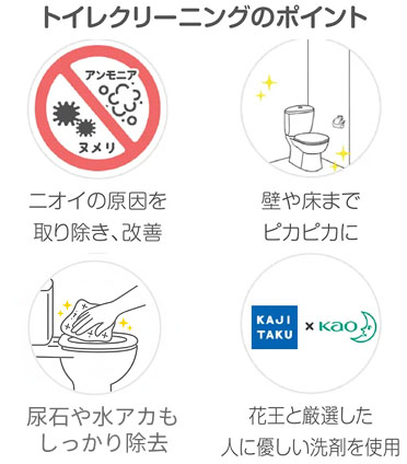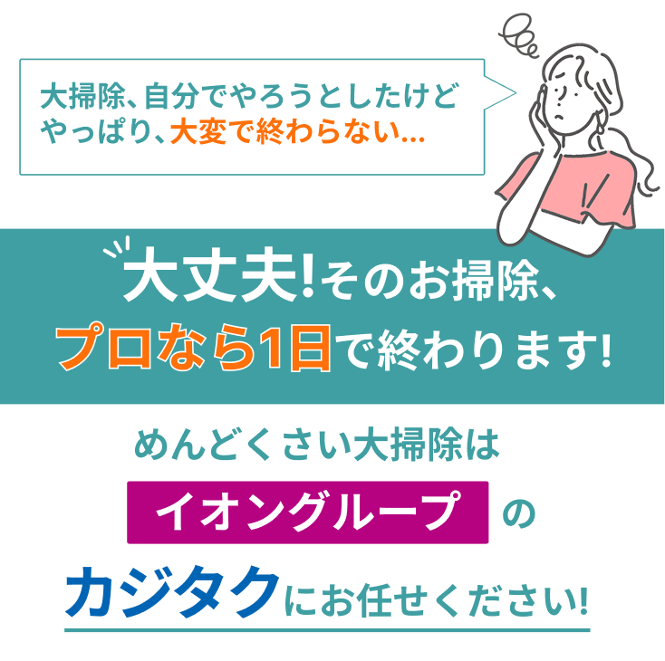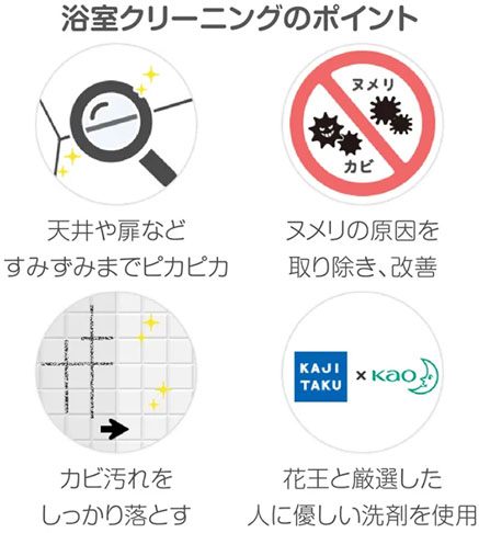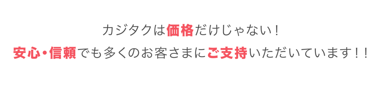 カジタクのハウスクリーニングは、汚れの種類や場所に合わせてプロが機材・洗剤を使い分け、しつこい汚れを徹底洗浄し、すみずみまでピカピカにします。 全国一律料金だから、最初から料金がわかっているので安心してサービスを購入・利用できます。 ※ 本サービスの利用規約、補償規定に従ってのご対応となります。