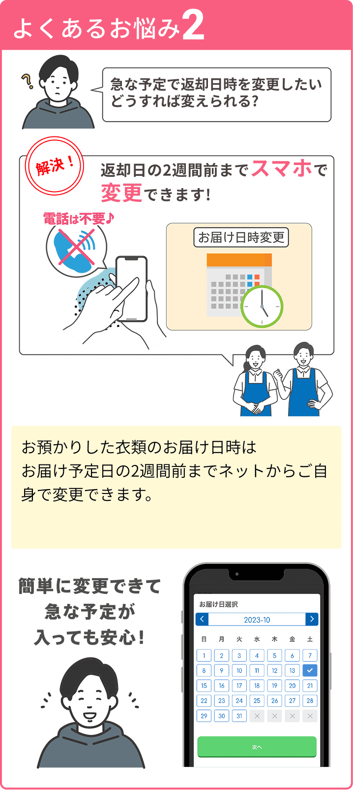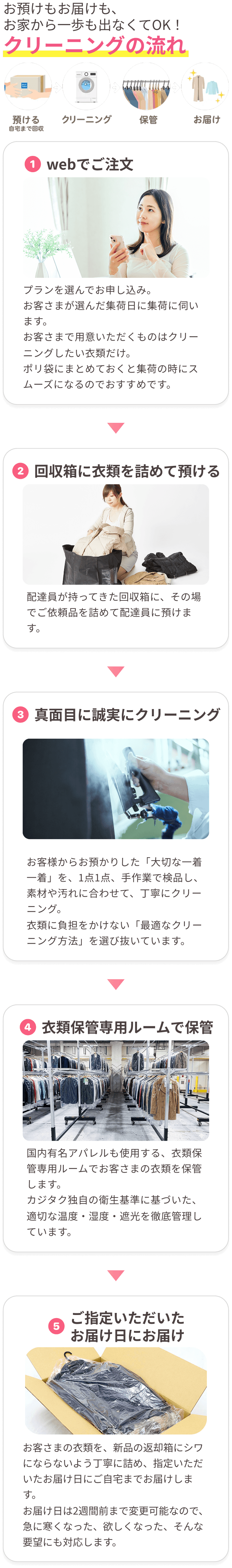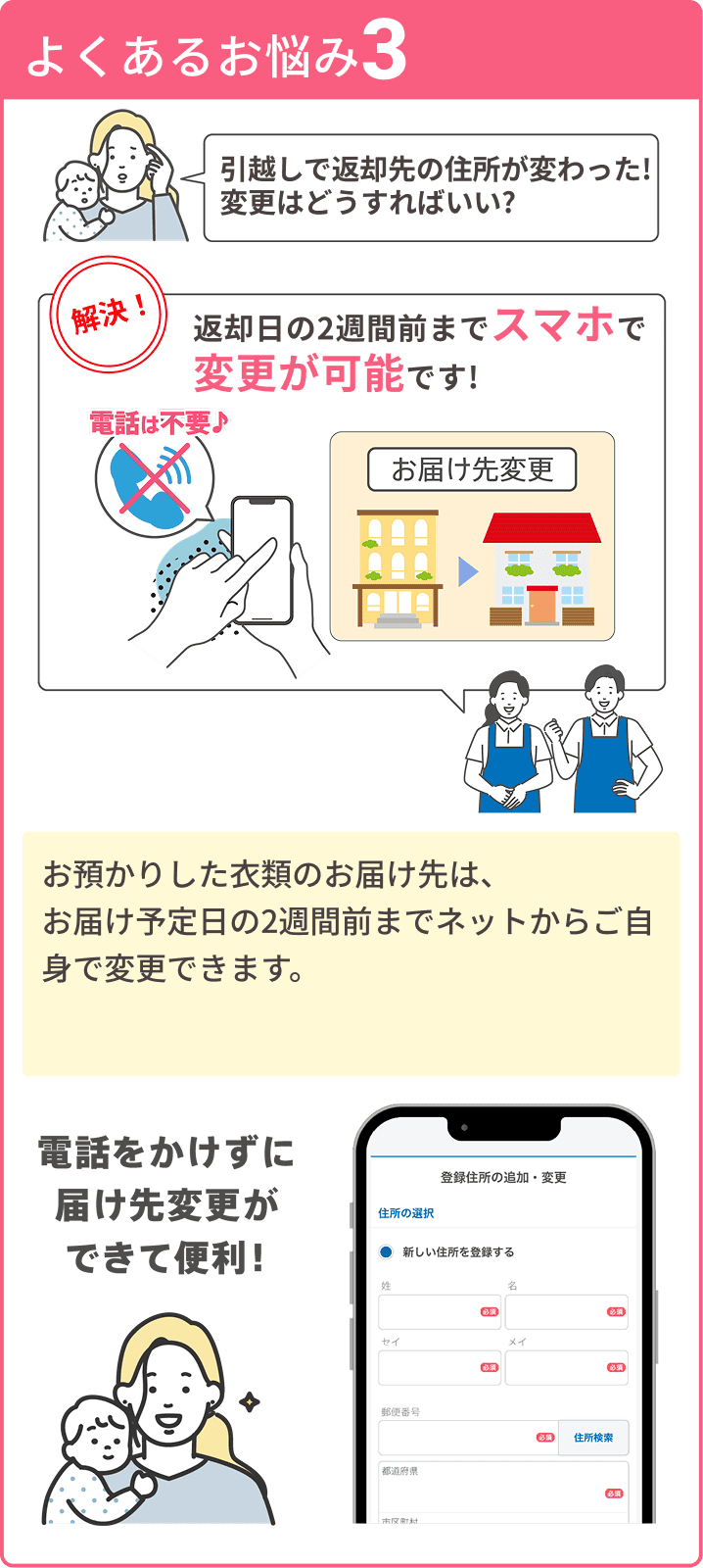 冬物のクリーニングと保管を毎年利用させていただいています。転勤族で賃貸マンション住まいのため、収納に限りがありオフシーズンに保管していただける点がとても助かっています。また、子どもが小さいため、かさばる冬物を自宅で集荷、仕上がりの配達をしてくださるのはとてもありがたいです。今後も引き続き、利用させていただきます。