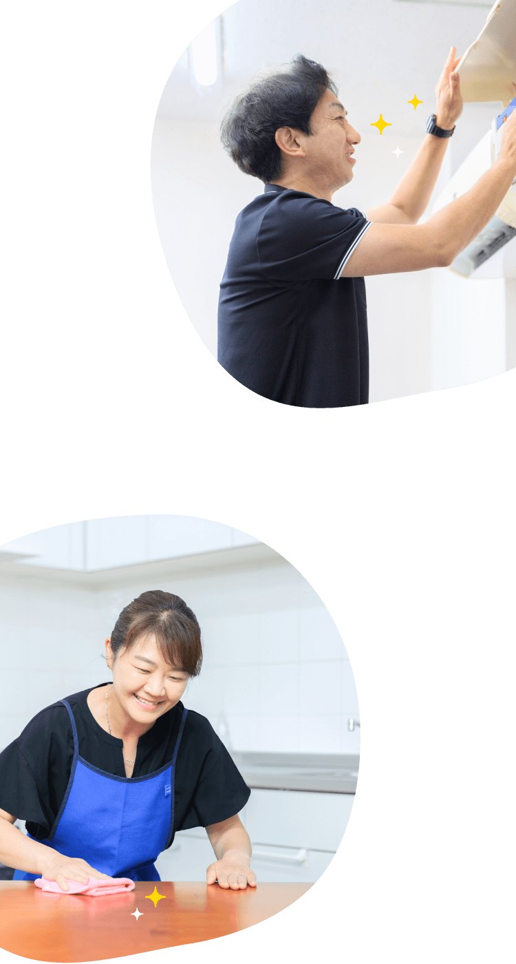 物の整理や収納方法の提案、不要品の処分などをサポート。効率的な収納の仕方や使いやすい動線をお伝えして快適な環境作りを支援します。